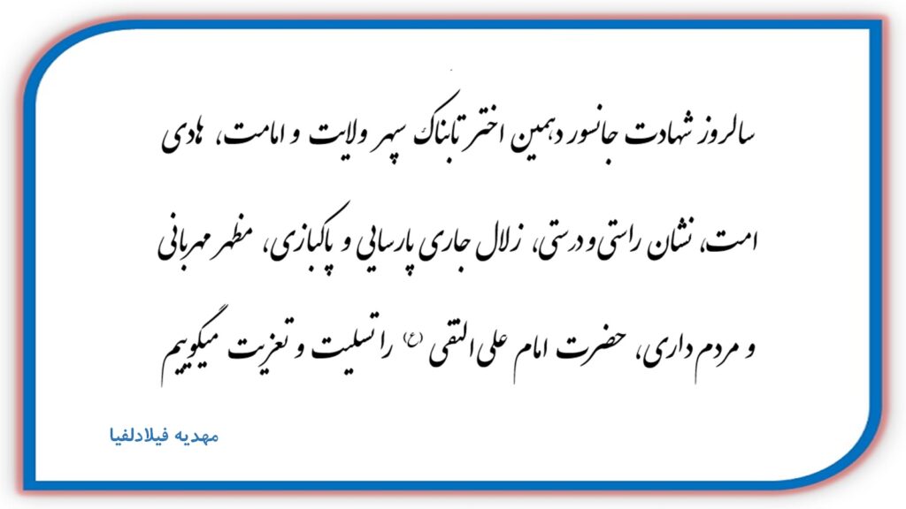 بِسْمِ اللَّـهِ الرَّحْمـٰنِ الرَّحِيمِ - « اللَّهُمَّ كُنْ لِوَلِيِّكَ الْحُجَّةِ بْنِ الْحَسَنِ صَلَوَاتُكَ عَلَيْهِ وَ عَلَى آبَائِهِ فِي هَذِهِ السَّاعَةِ وَ فِي كُلِّ سَاعَةٍ وَلِيّاً وَ حَافِظاً وَ قَائِداً وَ نَاصِراً وَ دَلِيلاً وَ عَيْناً حَتَّى تُسْكِنَهُ أَرْضَكَ طَوْعاً وَ تُمَتِّعَهُ فِيهَا طَوِيلاً » - بِرَحمَتِکَ یا اَرحَمَ الرّاحِمین